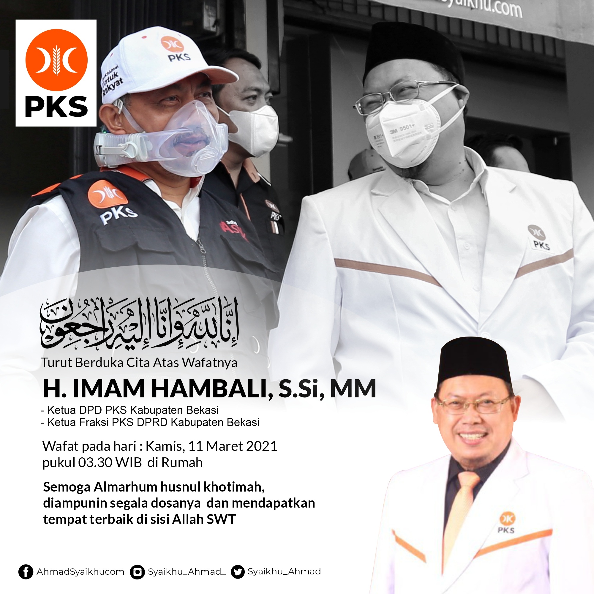 Presiden PKS Ahmad Syaikhu menyampaikan bahwa PKS sangat kehilangan atas wafatnya Ketua DPD PKS Almarhum H. Imam Hambali pada Kamis 11 Maret 2021 karena sakit. Hal ini disampaikannya saat memberikan sambutan pada acara acara do’a dan tahlil untuk almarhum yang digelar secara daring oleh DPD PKS Kabupaten Bekasi.