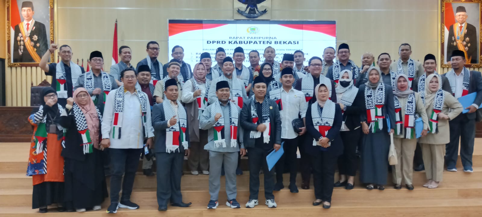 PKSBEKASI – Ada yang berbeda pada Rapat Paripurna DPRD Kabupaten Bekasi Rabu (14/11) kemarin. Seluruh unsur Pimpinan dan Anggota DPRD mengenakan syal bergambar bendera Indonesia dan Palestina. Begitu pula dengan Pj. Bupati Bekasi Dr. Dani Ramdan, MT yang hadir di Rapat Paripurna tersebut.