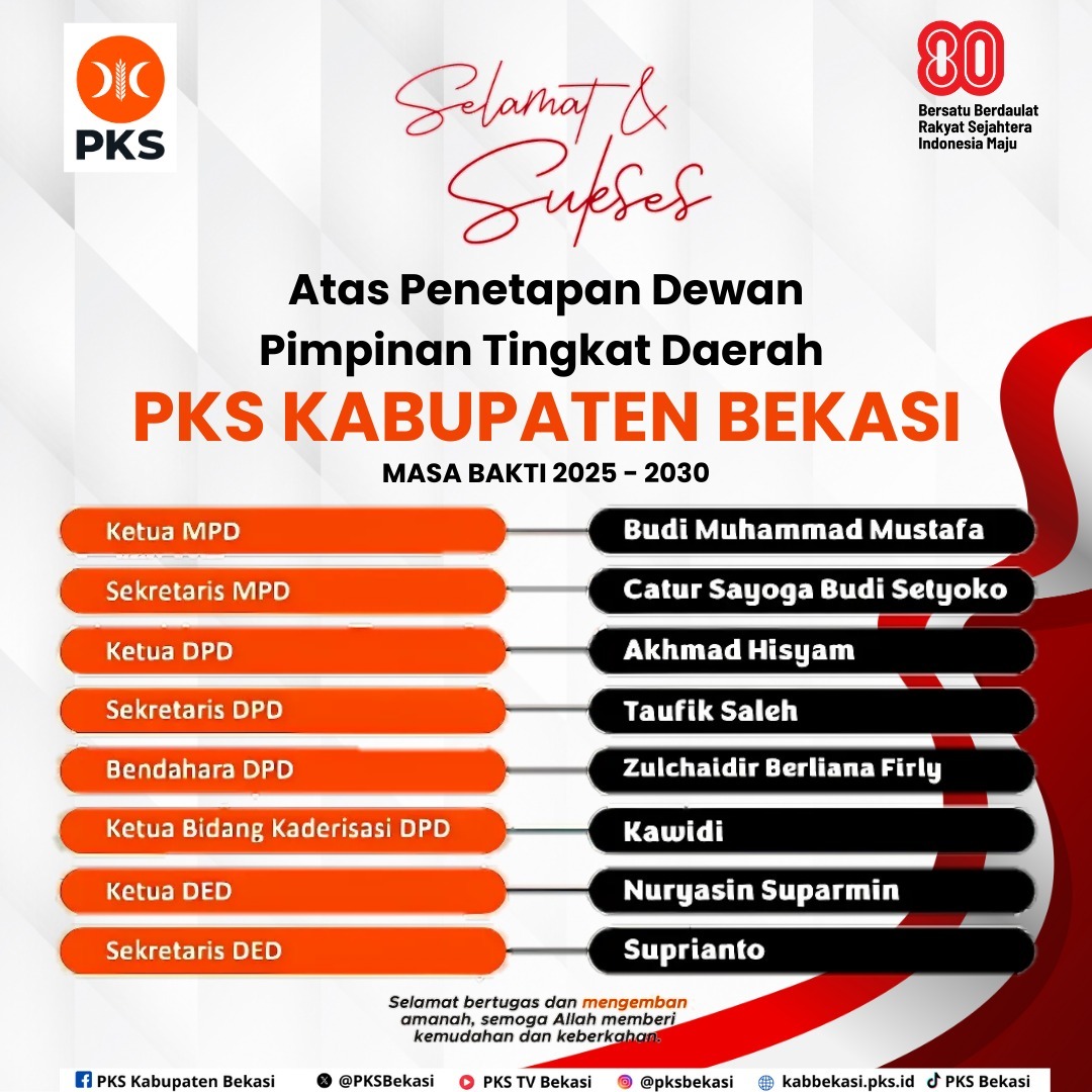 Adapun susunan DPTD PKS Kabupaten Bekasi Periode 2025-2030 adalah :