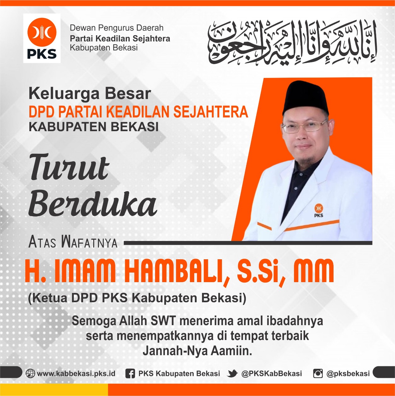 Berita duka cinta menyapa seluruh kader PKS terutama PKS Kabupaten Bekasi pada Kamis, 11 Maret 2021/ 27 Rajab 1442 H tepat pukul 03.30 wib, Ketua umum DPD PKS Kab. Bekasi Imam Hambali tutup usia di kediamannya Jalan Puspa 12 Mekar Indah Kota Jababeka – Cikarang Baru, Kec. Cikarang Utara, Kab. Bekasi.