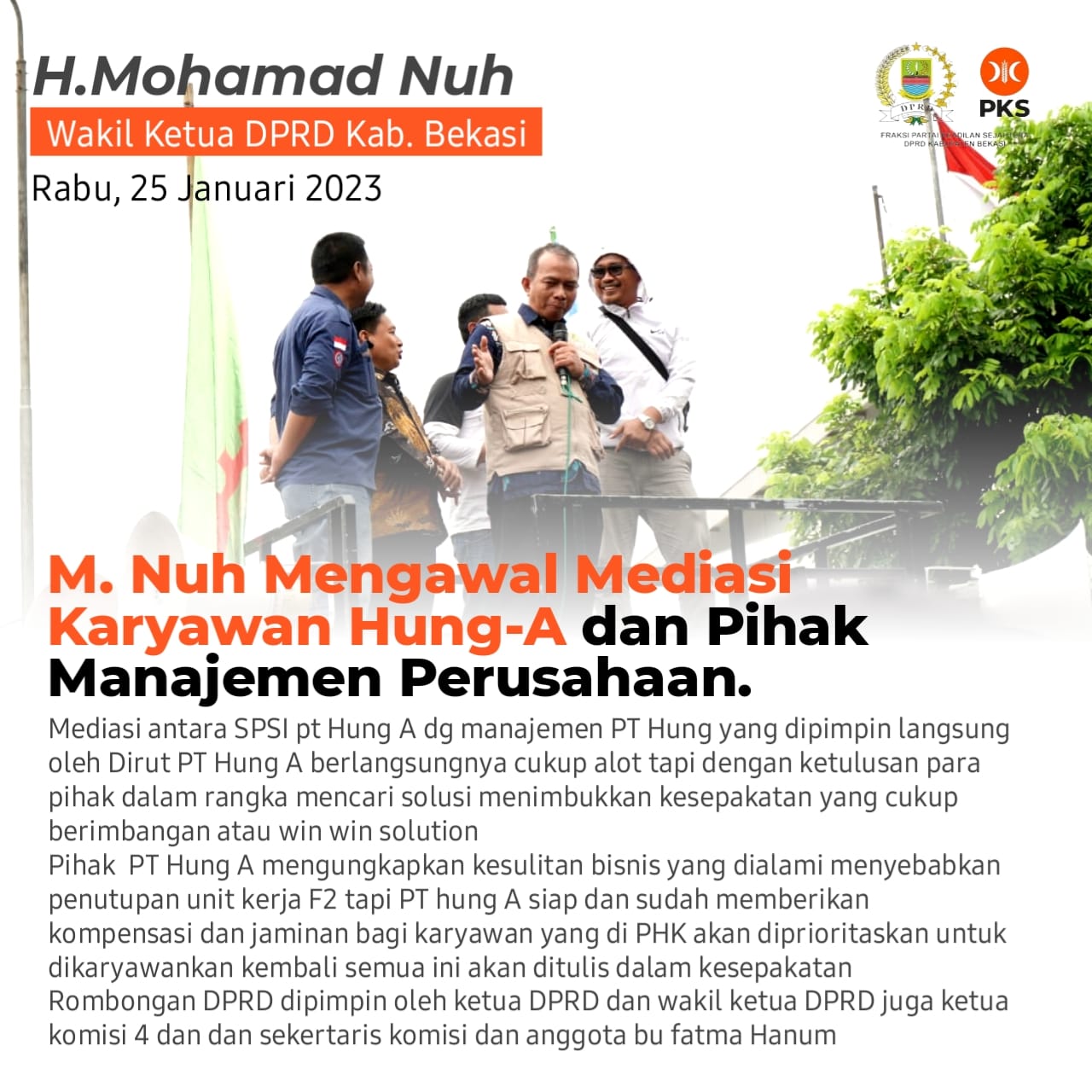 PKS Bekasi – Wakil ketua DPRD Kabupaten Bekasi, Mohamad Nuh melakukan kunjungan lapangan ke PT. HUNG-A dalam rangka proses mediasi atas kasus PHK dan memberikan solusi yag terbaik bagi permasalahan ketenagan kerjaan pada Rabu (25/1).