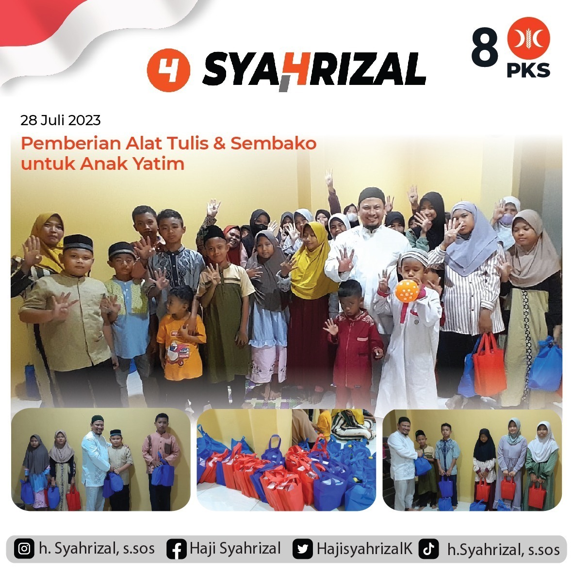 PKS Bekasi – H. Syahrizal, S. Sos Caleg PKS DPRD Kabupaten Bekasi No. 4. Pada hari Raya Anak yatim 10 Muharram 1445 H ini berkesempatan hadir dan memberikan bantuan Alat Tulis Sekolah dan Sembako di Rumah Yatim Yasmudia Kirana Cibitung pada Hari Jumat Malam, 28 Juli 2023. Bersama anak anak yatim binaan Yasmudia sebanyak 25 orang. Mereka dibina, dididik dan diberdayakan semenjak tahun 2016 sampai sekarang. Alhamdulillah H. Syahrizal, S.Sos merupakan Ketua Pembina di Yayasan Rumah Yatim Yasmudia ini.