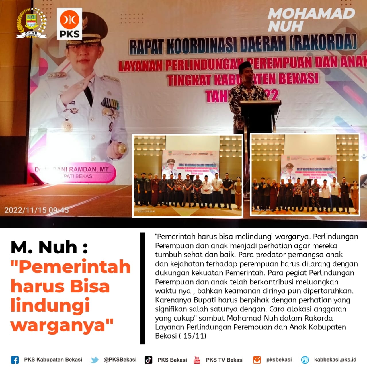 PKS Bekasi – Wakil Ketua DPRD Kabupaten Bekasi Mohamad Nuh menegaskan bahwa Pemerintah harus bisa melindungi warganya terutama perempuan dan anak-anak. Hal ini sebagaimana disampaikannya saat memberikan sambutan apada acara Rapat Koordinasi Daerah (Rakorda) Perlindungan Perempuan dan Anak tingkat Kabupaten Bekasi di Nuanza Hotel, Cikarang Barat pada Selasa (15/11).