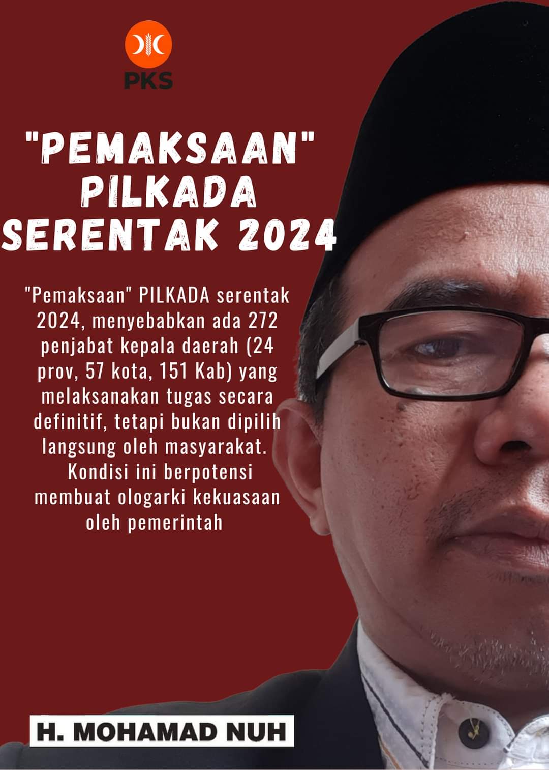 “Jika dipaksakan, Pilkada serentak pada tahun 2024, maka sejumlah 272 kepala daerah (24 Gubernur, 57 Walikota dan 151 Bupati) akan dilantik dan mengisi kekosongan kepala daerah pada tahun 2022 hingga 2024 yang melaksanakan tugas secara definitif tetapi bukan dipilih langsung oleh masyarakat. Kondisi ini berpotensi membuat oligarki kekuasaan oleh pemerintah” terang Ketua DPD PKS Kabupaten Bekasi periode 2010-2020 ini di Bekasi pada Sabtu (20/3).