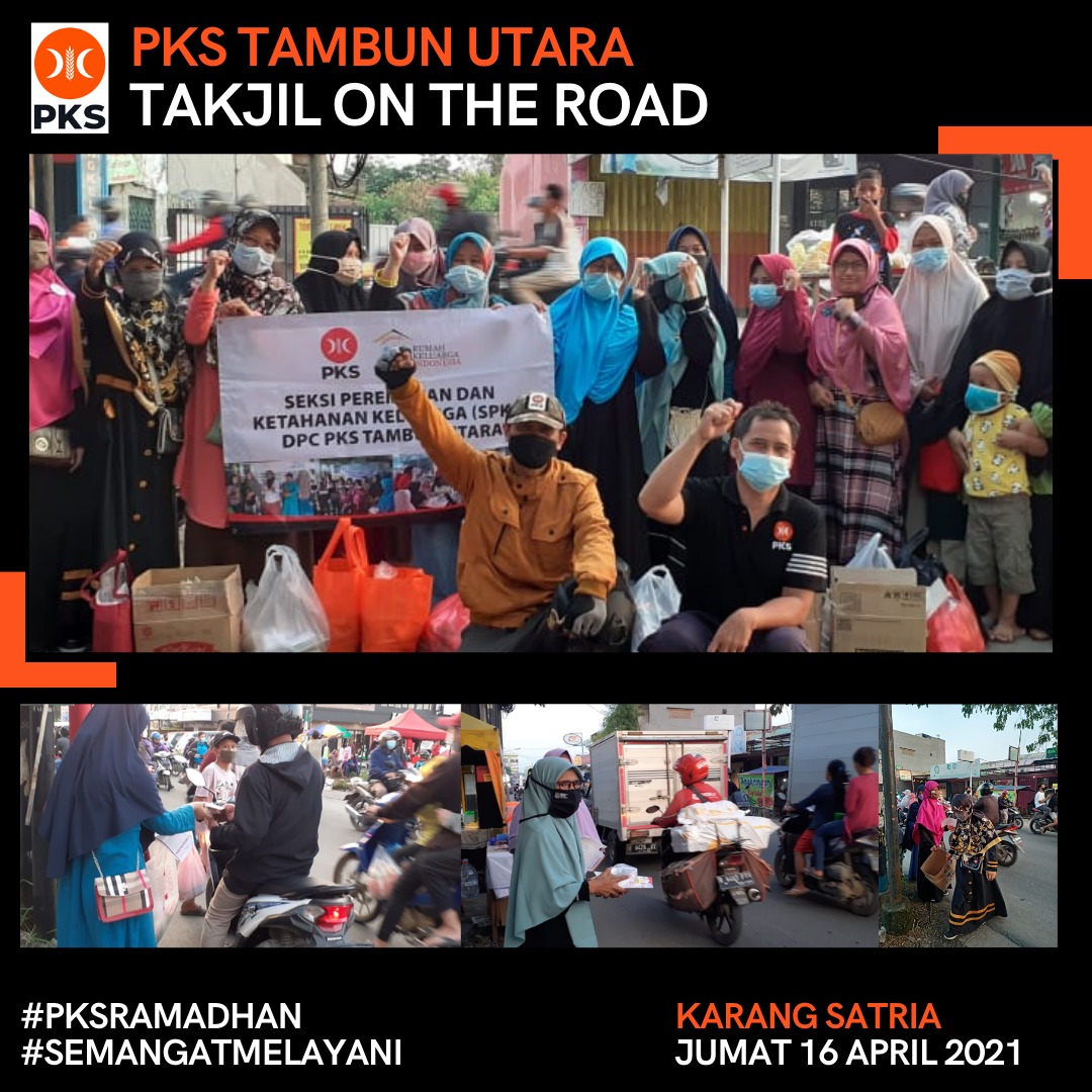DPC PKS Tambun Utara bersama RKI (Rumah Keluarga Indonesia), pada hari Jumat 16 April 2021 melaksanakan kegiatan Ifthor On The Road (alias bagi-bagi takjil), kegiatan berlangsung meriah dihadiri sekitar 20 anggota PKS Tambun Utara. Kurang dari 30 menit 200 paket takjil habis dibagikan. Acara yang berlangsung di depan Gerbang Perumahan Taman Alamanda Karang Satria mendapat respon yang sangat baik dari masyarakat.