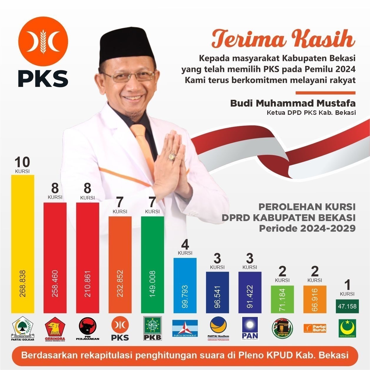 PKS Bekasi – Ketua DPD PKS Kabupaten Bekasi Budi Muhammad Mustafa mengatakan bahwa partainya akan tetap berkomitmen melayani rakyat meskipun hasil perolehan kursi partainya mengalami penurunan pada Pemilu 2024 ini.