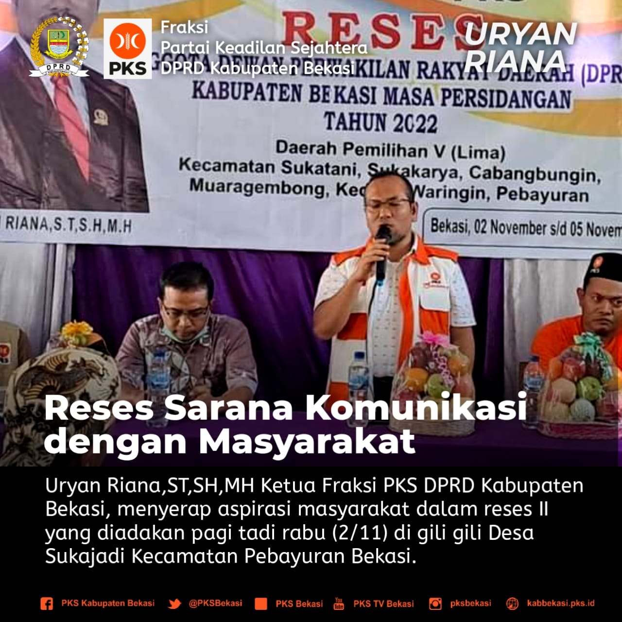 Anggota Dewan Perwakilan Daerah (DPRD) Kabupaten Bekasi fraksi PKS Uryan Riana hari ini, melakukan agenda reses masa sidang tahun 2022, Rabu (02/11). Reses dapil V yang meliputi Kecamatan Sukatani, Sukakarya, Cabangbungin, Pebayuran, Kedungwaringin dan Muaragembong ini bertempat di Kp. Gili-gili, Desa Sukajaya, Kecamatan Sukakarya Kabupaten Bekasi.
