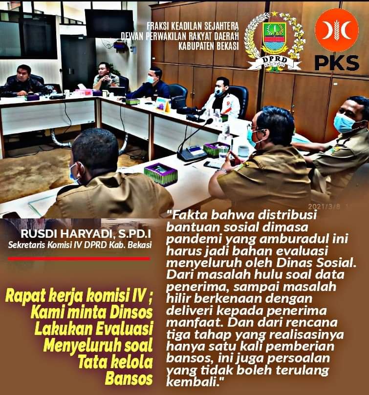 Sekretaris Komis IV DPRD Kabupaten Bekasi Rusdi Haryadi meminta kepada Dinas Sosial Kabupaten Bekasi untuk mengevaluasi secara menyeluruh terkait tata kelola bantuan sosial dari hulu hingga hilir. Hal ini sebagaimana disampaikannya dalam Rapat Kerja komisi IV dengan Dinas Sosial di gedung DPRD Kabupaten Bekasi pada Senin (8/3).