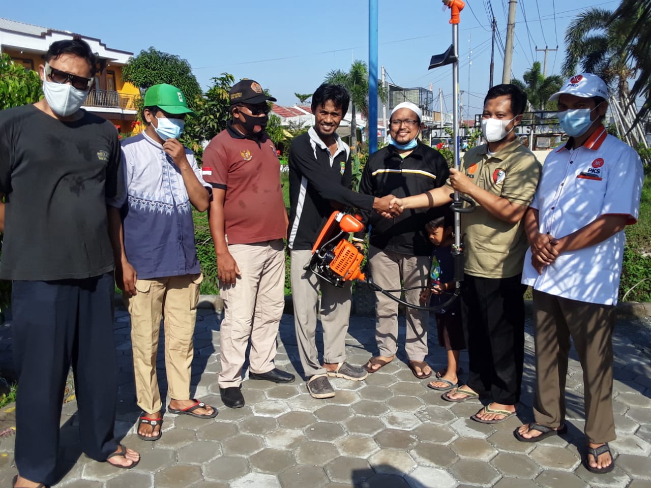 Ketua DPC PKS Karang Bahagia, Supriyanto menyerahkan mesin potong rumput kepada Ketua RW 07 Perum Sukaraya Indah, Hambali