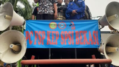Wakil Ketua DPRD Kabupaten Bekasi Mohamad Nuh berorasi di atas mobil komando massa buruh dari…