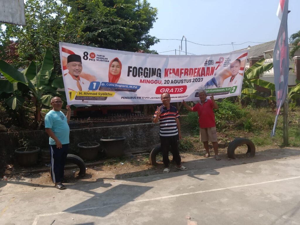 PKS BEKASI – Tiga Calon Anggota Legislatif (Caleg) dari PKS melakukan Fogging Kemerdekaan Gratis di RW 17 Pondok Timur Indah (PTI), Jatimulya, Tambun Selatan, Ahad (19/8).