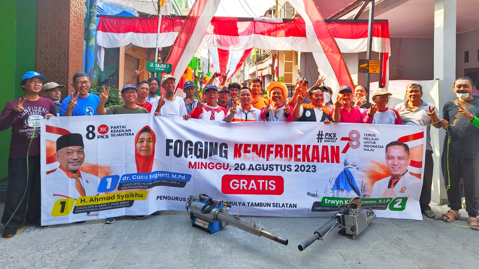 PKS BEKASI – Tiga Calon Anggota Legislatif (Caleg) dari PKS melakukan Fogging Kemerdekaan Gratis di RW 17 Pondok Timur Indah (PTI), Jatimulya, Tambun Selatan, Ahad (19/8).