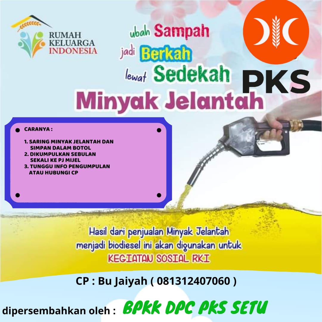 “Ubah sampah jadi berkah dengan sedekah minyak jelantah”, demikian komentar Ahmad Jazuli selaku ketua DPC PKS Setu memberikan apresiasi pada gagasan bidang yang digawangi oleh Jaiyah selaku ketua BPKK Kecamatan Setu.