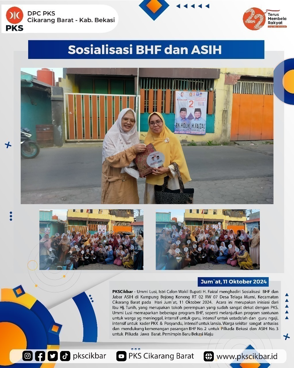 PKS Bekasi – Istri Cawabup Bekasi Faizal Hafan Farid, Ummi Lusi menghadiri acara sosialisasi Calon Bupati dan Wakil Bupati Bekasi BN Holik – Faizal (BHF) dan Calon Gubernur dan Wakil Gubernur Jawa Barat Jabar Ahmad Syaikhu – Ilham Habibie (ASIH) di Kampung Bojong Koneng RT. 02 RW. 07 Desa Telaga Murni, Kecamatan Cikarang Barat pada Jum`at (11/10). Acara ini merupakan inisiasi dari Ibu Hj. Tunih, yang merupakan tokoh perempuan yang sudah sangat dekat dengan PKS.