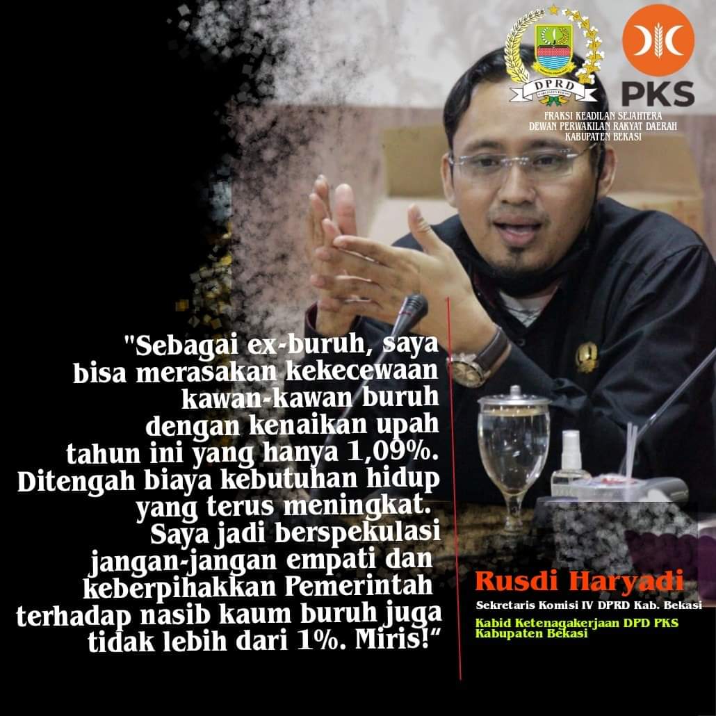 Sekretaris Komisi 4 DPRD Kabupaten Bekasi Rusdi Haryadi merasa miris atas keputusan Gubernur Jawa Barat Ridwan Kamil yang tidak menaikkan Upah Minimum Kabupaten (UMK) Bekasi Tahun 2022. Hal ini menjadi preseden buruk bahwa pemerintah tidak berpihak kepada buruh. Hal ini diungkapkannya menanggapi Surat Keputusan Gubernur Jawa Barat Ridwan Kamil bernomor 561/Kep.732-Kesra/2021 tertanggal 30 Nopember 2021 mengenai Upah Minimum Kabupaten/Kota di Daerah Propinsi Jawa Barat Tahun 2022.