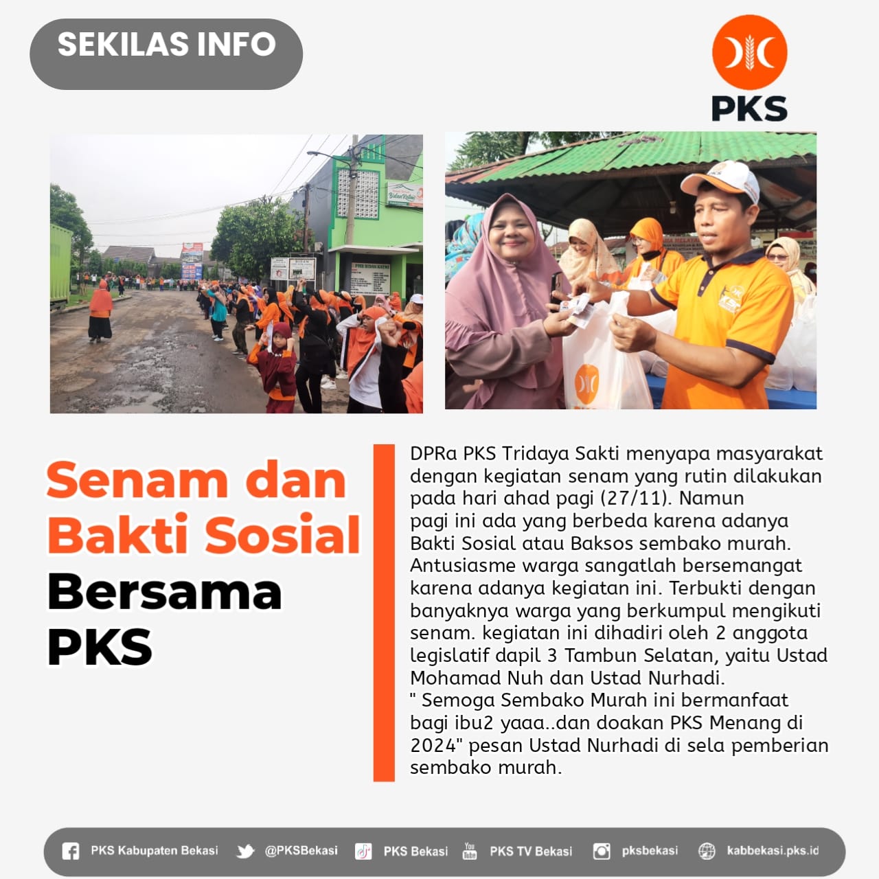 PKS Bekasi – DPRa PKS Tridaya Sakti Kecamatan Tambun Selatan menyapa masyarakat dengan kegiatan senam yang rutin dilakukan pada Ahad. Kegiatan PKS Menyapa pada Ahad (27/11) kali ni dilaksanakan di depan kantor Rw.016 Perum Taman Puri Cendana dengan agenda utama Bakti Sosial atau Baksos sembako murah.